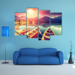 - Three Canoes on Mountain Lake at Sunset Canvas Wall Art