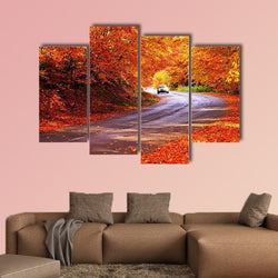 - Sunny Red Autumn Road with White Car Canvas Wall Art