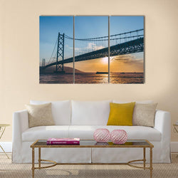 - Sunset Over Suspension Bridge and Cargo Ships Canvas Wall Art