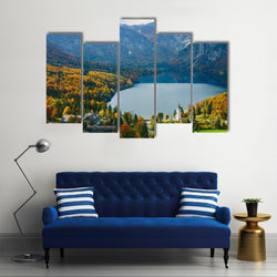 - Autumn Lake with Church and Mountains Canvas Wall Art